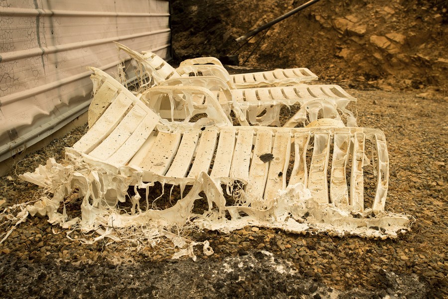 Read moreMelted lawn chairs sit outside a residence leveled by the Detwiler fire near Mariposa, California, on July 19, 2017. A surging wildfire raced through California mountains and foothills west of Yosemite National Park on Wednesday, forcing thousands to flee tiny, Gold Rush-era towns. #