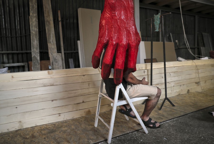 Read moreArtist Catalin Badarau is obscured by one of his works during an interview with the Associated Press in Bucharest, Romania, on July 19, 2017. An art exhibition showcasing 11 sculptures that aims to remind visitors about the horrors that took place from 1949 to 1951 at southern Romania's Pitești Prison, where communists tortured and killed political prisoners in a gruesome reeducation program, went on display on July 21, 2017. #