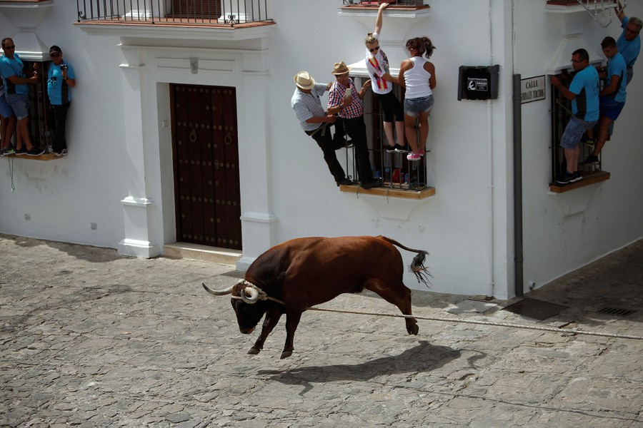 Read morePeople hold onto windows to avoid a bull named Trompetero during the Toro de Cuerda ("Bull on a Rope") festival in Grazalema, Spain, on July 17, 2017. Three bulls restrained by a rope are allowed to run through the streets of the village during the annual festival. #