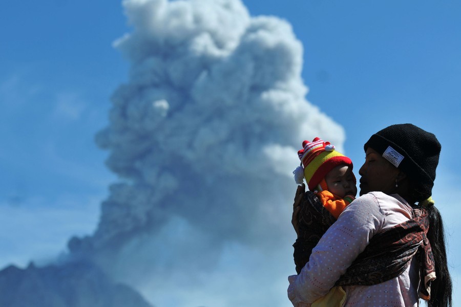 Read moreA woman carries her child as she watches Mount Sinabung spewing thick volcanic ash, as seen from Karo on July 21, 2017. Sinabung roared back to life in 2010 for the first time in 400 years. After another period of inactivity it erupted once more in 2013, and has remained highly active since. #