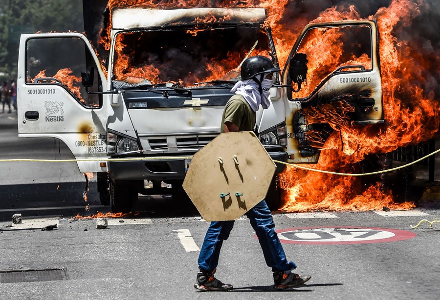Read moreA truck set ablaze by opposition activists blocking an avenue during a protest burns in Caracas on July 18, 2017. The Venezuelan opposition called for a 24-hour national civic strike next Thursday to pressure President Nicolás Maduro to withdraw the call to a National Constituent Assembly after achieving a massive vote of rejection in a symbolic plebiscite. #