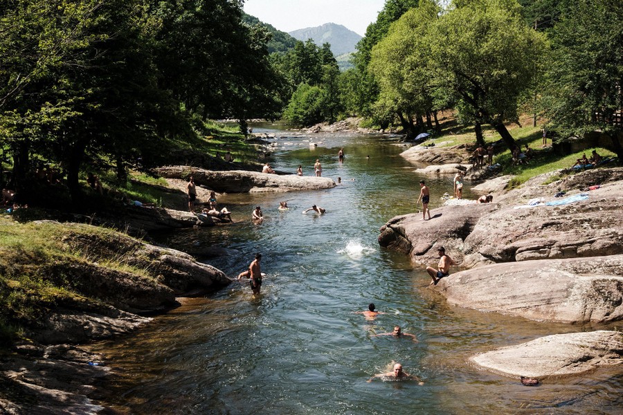 Read morePeople swim and sunbathe on a bank of the river Vit near Teteven, Bulgaria, on July 1, 2017, as temperatures reached 112 degrees Fahrenheit (44 Celsius). Five people died on July 1, as soaring temperatures hit the Bulgarian capital Sofia. #