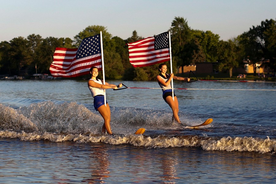 Read moreTwo members of the Kwahamot Waterski Team hold American flags as they pass the audience during the team's Independence Day waterski show in Tomahawk, Wisconsin, on July 4, 2017. #