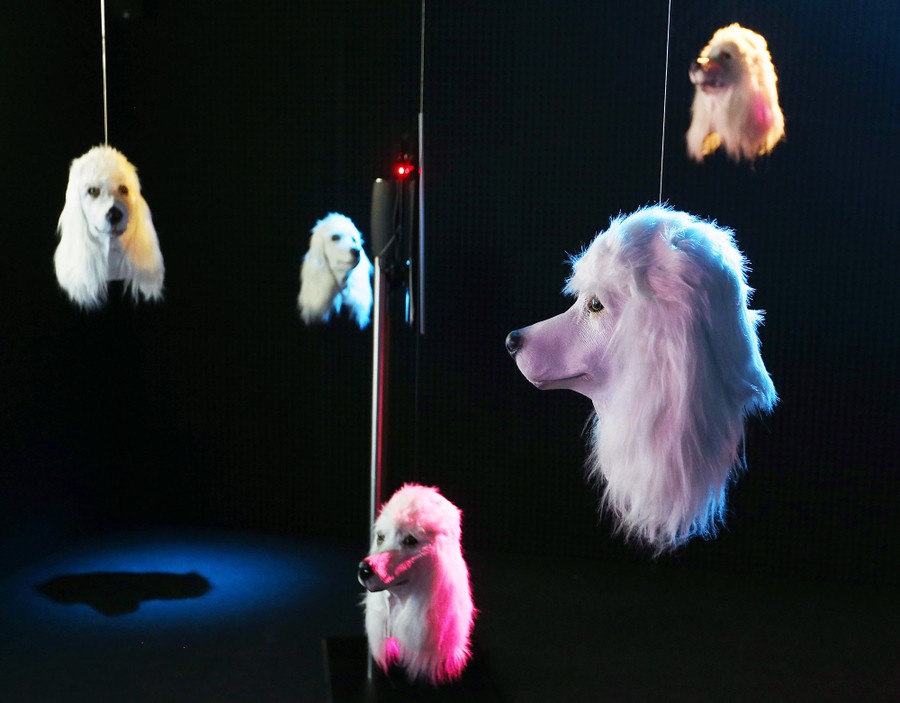 Read moreArtificial dog heads by British artist Heather Phillipson sway in a dark room of the Schirn museum in Frankfurt, Germany, on July 3, 2017. The installation, called "100% Other Fibres," is part of the exhibition Peace that opened last weekend. #