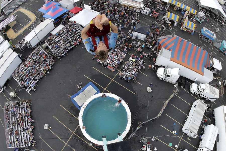 Read moreChicagoan James Lichtenstein dives from an 85-foot-tall platform into a 9.5-foot pool during a performance by the Firemen High Dive Show at the State Fair Meadowlands carnival in East Rutherford, New Jersey, on July 6, 2017. #