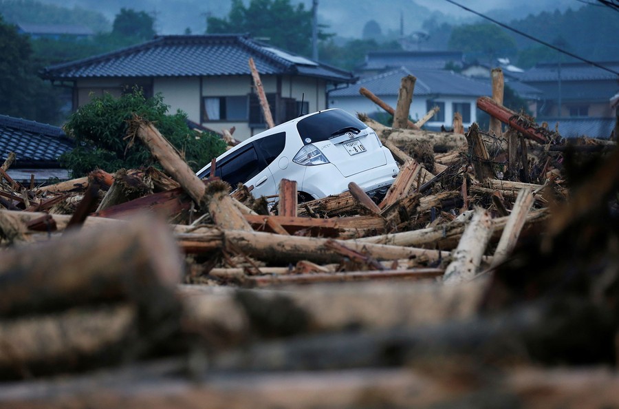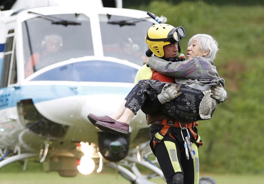 Read morePeople who were stranded and rescued by a helicopter following heavy rain in southwestern Japan arrive in the city of Asakura, Fukuoka Prefecture, Japan, on July 7, 2017. #