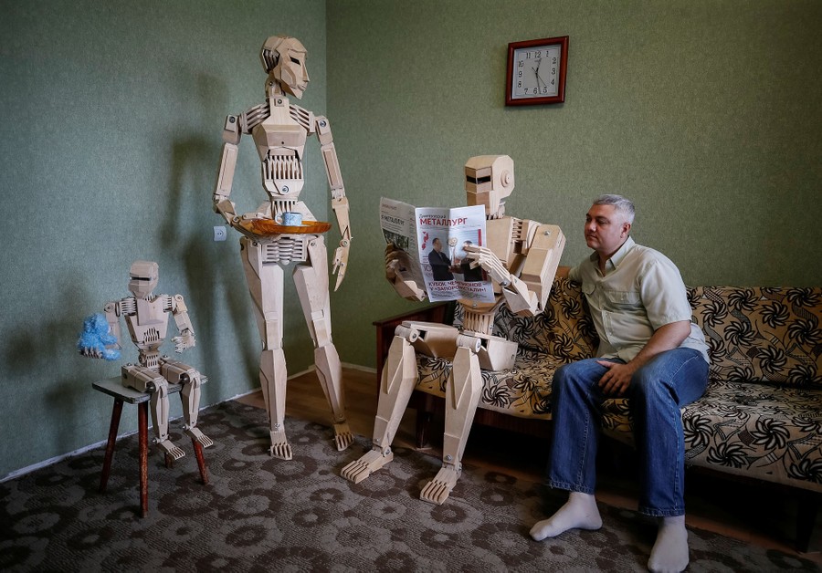 Read moreDmitry Balandin poses with his wooden models Centurion (seated), Amazon, and Kid (left), in his flat in Zaporizhzhya, Ukraine, on July 5, 2017. It took Balandin, who works as a crane operator, 18 months to build the models from 1,750 parts. Balandin says he does not use blueprints and instead designs the parts as he works on them. #