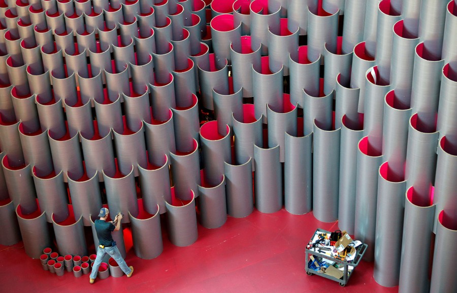 Read moreAn install team member works on Studio Gang's "Hive," the latest Summer Block Party interactive installation, at the National Building Museum in Washington, DC, on July 3, 2017. #