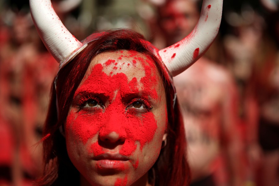 Read moreAnimal-rights protesters stand still after breaking mock banderillas containing red powder, which covered them during a demonstration for the abolition of bull runs and bullfights, a day before the start of the famous running of the bulls San Fermin festival in Pamplona, northern Spain, on July 5, 2017. #