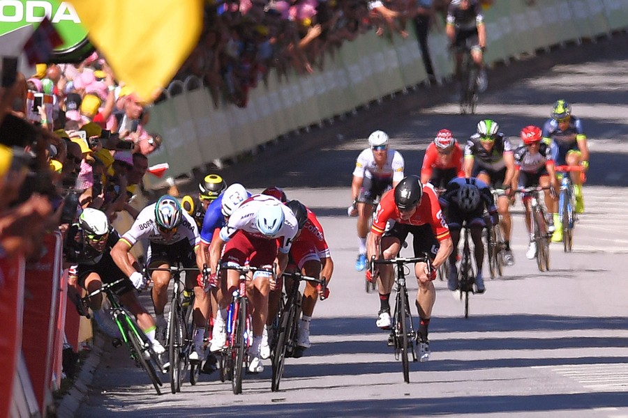 Read moreDuring the 104th Tour de France in Vittel, France, cyclist Mark Cavendish (far left) falls after tangling with competitor Peter Sagan in the final sprint of Stage 4. Cavendish suffered a fractured shoulder blade, and Sagan was disqualified for the incident. #