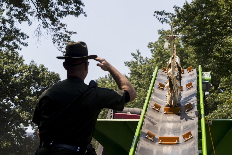 Read moreA New York State Environmental Conservation officer salutes as an ivory sculpture rolls up a conveyor belt into a crusher on August 3, 2017, in New York's Central Park. The New York State Department of Environmental Conservation destroyed illegal ivory confiscated through state enforcement efforts. #