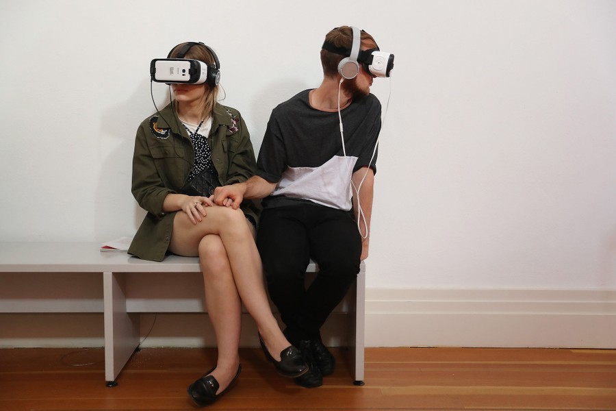 Read moreA couple wearing headphones and virtual reality goggles experience the Rhizomat VR art piece by artist Mona El Gammal at Martin-Gropius-Bau on July 28, 2017 in Berlin, Germany. The work is a 360 degree 12-minute movie about an underground movement rebelling against a global, private company that has replaced the state and monitors people with the promise of security and stability. #
