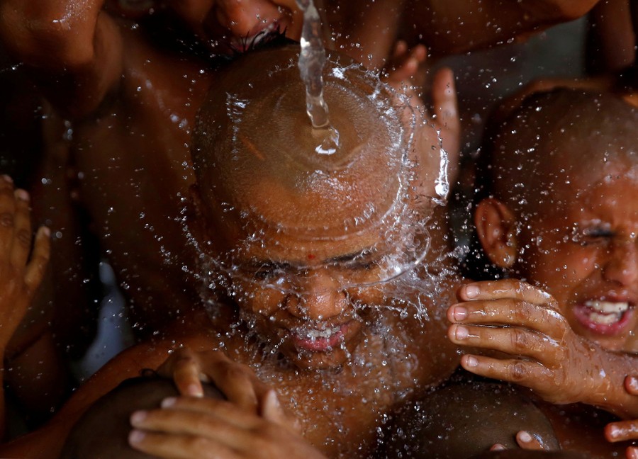 Read moreYoung Hindu priests take a holy bath together as part of a ritual during the sacred thread festival at the Pashupatinath temple in Kathmandu, Nepal, on July 28, 2017. Hindus take holy baths and change their sacred threads, also known as ianai, for protection and purification during the festival. #