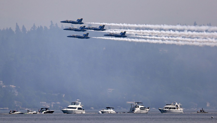 Read moreU.S. Navy Blue Angels fly during a practice session over boats lined up along a log boom on Lake Washington in Seattle on August 3, 2017. The team will perform Friday, Saturday and Sunday in the annual Seafair Air Show. #