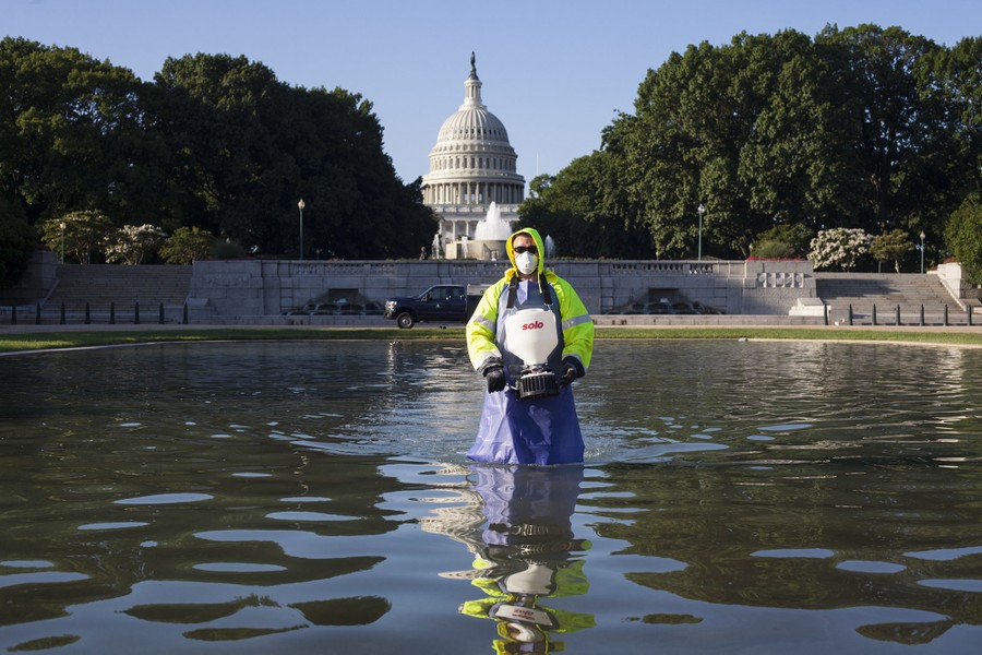 Read moreRonnie Pfeiffer, a plumber with the Architect of the Capitol, spreads chlorine pellets in the reflecting pool in Lower Senate Park on Capitol Hill to deter algae growth following recent heavy rains in Washington, on July 31, 2017. #