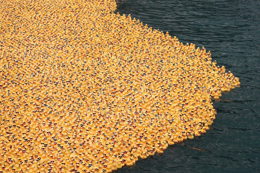 Read moreThousands of rubber ducks float down the Chicago River during the Windy City Rubber Ducky Derby on August 3, 2017 in Chicago, Illinois. Derby organizers drop 60,000 rubber ducks from a bridge above the river to start a race which helps to raise about $350,000 for Special Olympics Illinois. The sponsor of the first duck to float across the finish line is awarded a new SUV. #