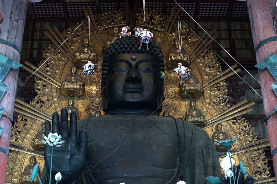 Read moreBuddhist monks clean the dust off of the 15-meter-high Great Buddha at Todaiji Temple on August 7, 2017 in Nara, Japan. The Great Buddha of Nara, built in AD 752, and one of the National Treasures of Japan, is being prepared for the Buddhist festive period called Bon in mid August. #