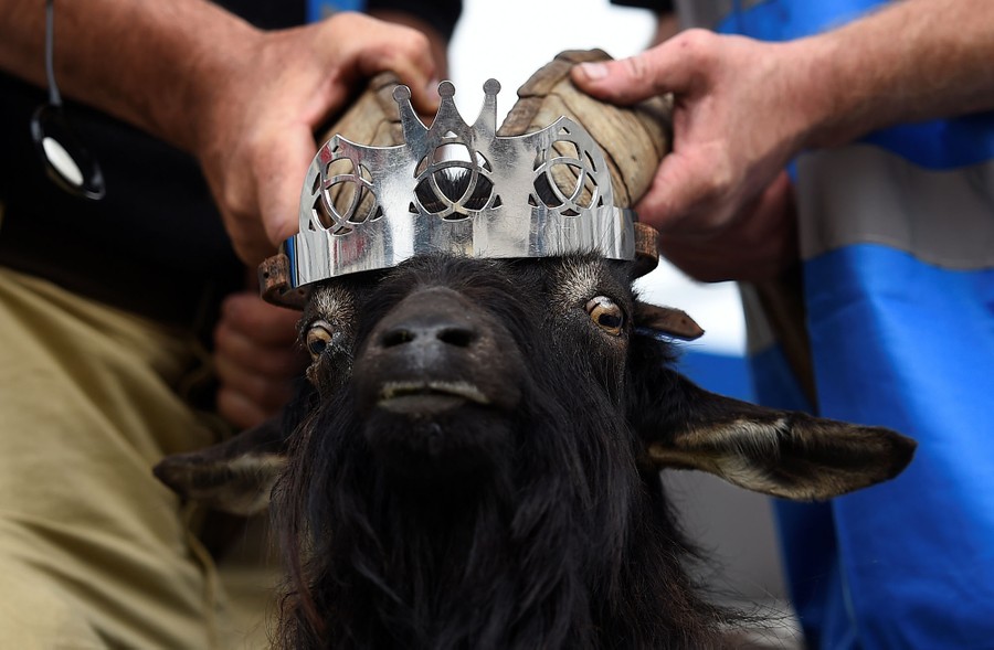 Read moreA crown is affixed to a wild goat as it is crowned King Puck and will be held on a platform above the town for three days in Killorglin, Ireland, on August 10, 2017. #