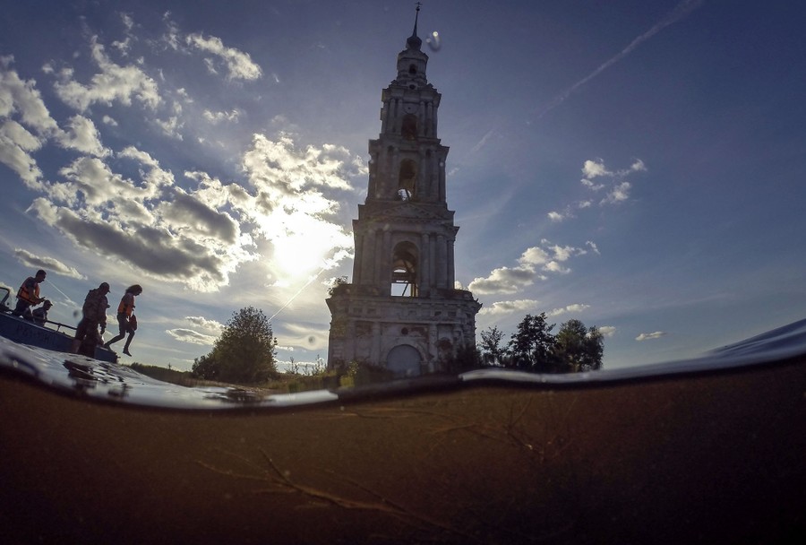 Read morePeople disembark to visit the famous Kalyazin Bell Tower, part of submerged monastery of St. Nicholas in the town of Kalyazin located on the Volga River, 180 km (111 miles) northeast of Moscow, Russia, on August 9, 2017. After the construction of the Uglich Dam in 1939 to form the Uglich Reservoir, the old parts of Kalyazin, including several medieval structures, were submerged under the reservoir's waters. #