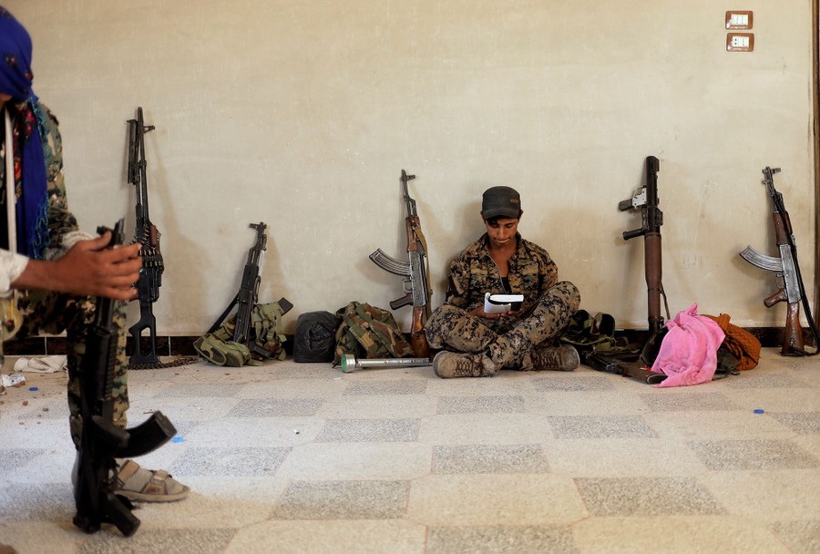 Read moreMohamed, 17, a member of the Syrian Democratic Forces reads as he waits for instructions during fighting with Islamic State in Al Senaa, a district of Raqqa, Syria, on August 10, 2017. #