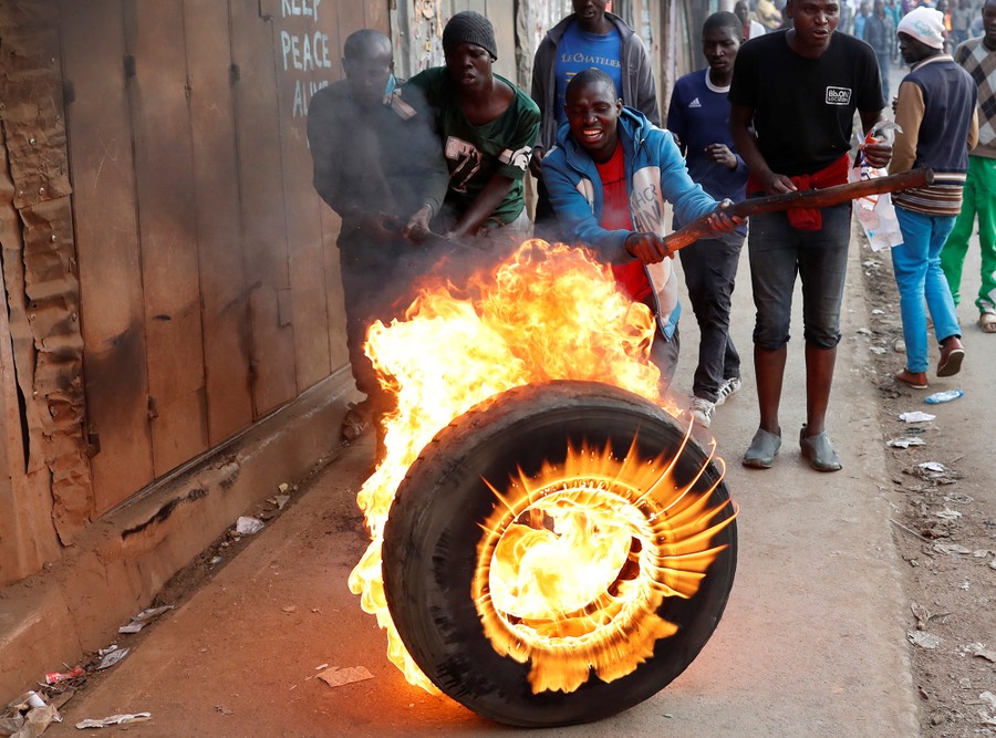Read moreA man seeking safety walks with his hands in the air through a thick cloud of tear gas towards riot police, as they clash with protesters throwing rocks in the Kawangware slum of Nairobi, Kenya, on, August 10, 2017. International observers on Thursday urged Kenyans to be patient as they awaited final election results following opposition allegations of vote-rigging, but clashes between police and protesters again erupted in Nairobi. #