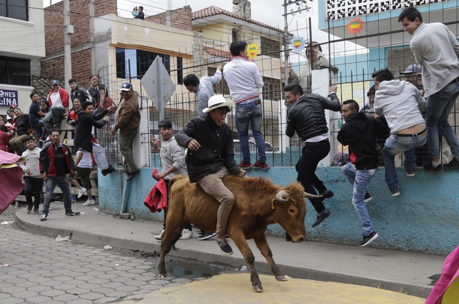 Read moreA man rides a bull during a running of the bulls event coined "Pamplonada Pillarense" in Pillaro, Ecuador, on August 5, 2017. The small Andean city sets loose about 40 bulls during its annual fair. #