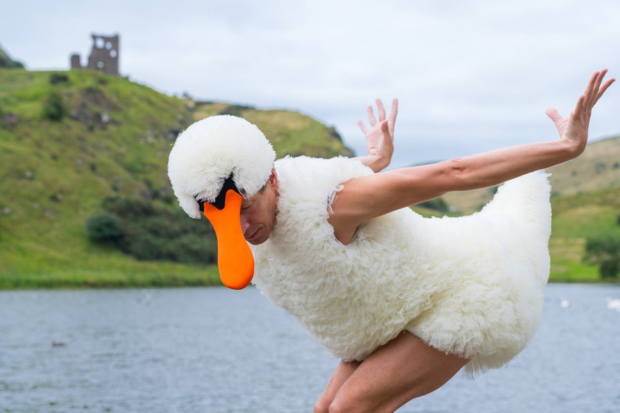 Read moreA dancer from 'Tutu', performs at St Margaret's Loch in his spoof Swan Lake costumes on August 10, 2017 in Edinburgh, Scotland. Their Edinburgh Festival Fringe show is an invitation to those who love dance to experience familiar favorites, in an opportunity to explore some of the most famous and significant works in the repertoire from Swan Lake to Pina Bausch in a fun way with with a twist. #