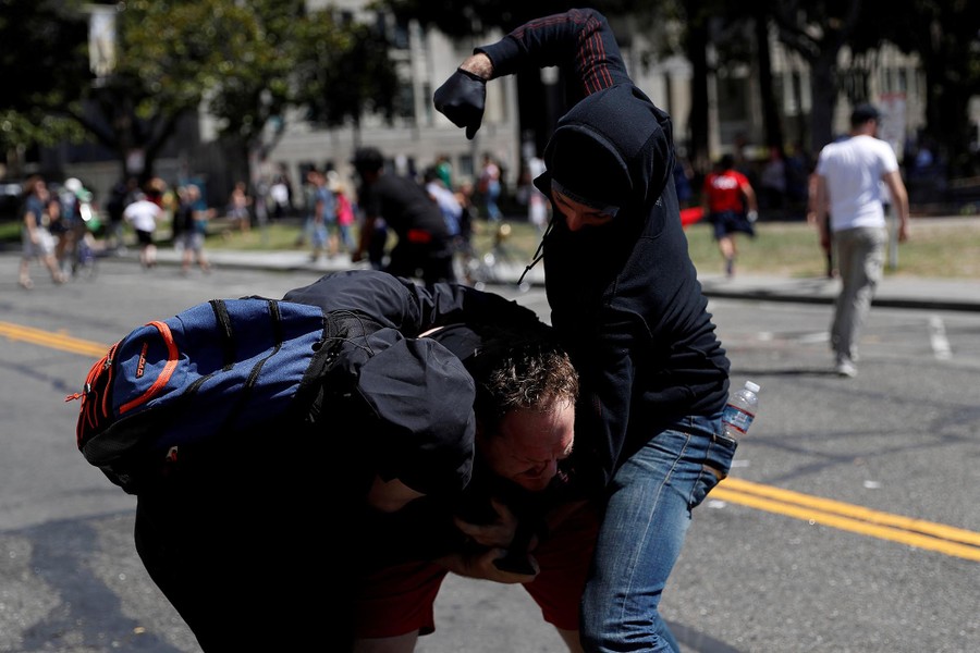 Read moreA photographer is attacked by masked demonstrators in Martin Luther King Jr. Civic Center Park during a cancelled No Marxism in America rally and counter-protest in Berkeley, California, on August 27, 2017. #