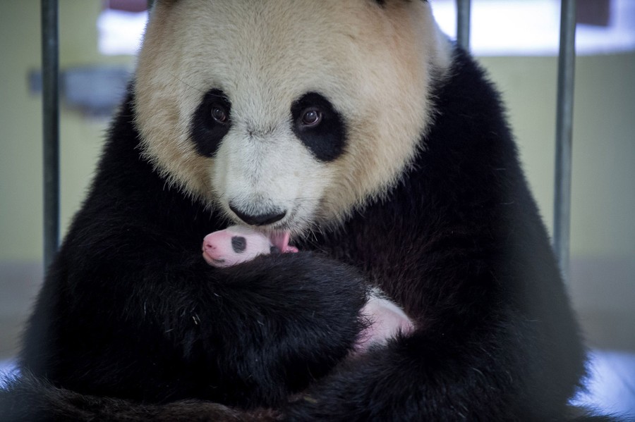 Read moreFemale panda Huan Huan holds her cub inside her enclosure at the Beauval Zoo in Saint-Aignan-sur-Cher, France, on August 28, 2017. Nine-year-old Huan Huan gave birth to twins on August 4, 2017, but one died soon afterwards. Breeding pandas is notoriously difficult and this is the first time a cub has been born in France. #