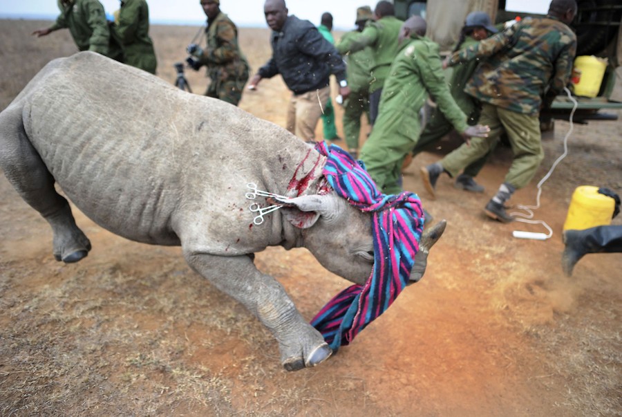 Read moreA Kenya Wildlife Services veterinarian and security personnel back away from a tranquilized black rhino calf on August 30, 2017, after she appeared to prematurely overcome the sedative at the Nairobi National Park, during an identification-tagging exercise to ease the quick identification of resident rhinos during anti-poaching patrols. #
