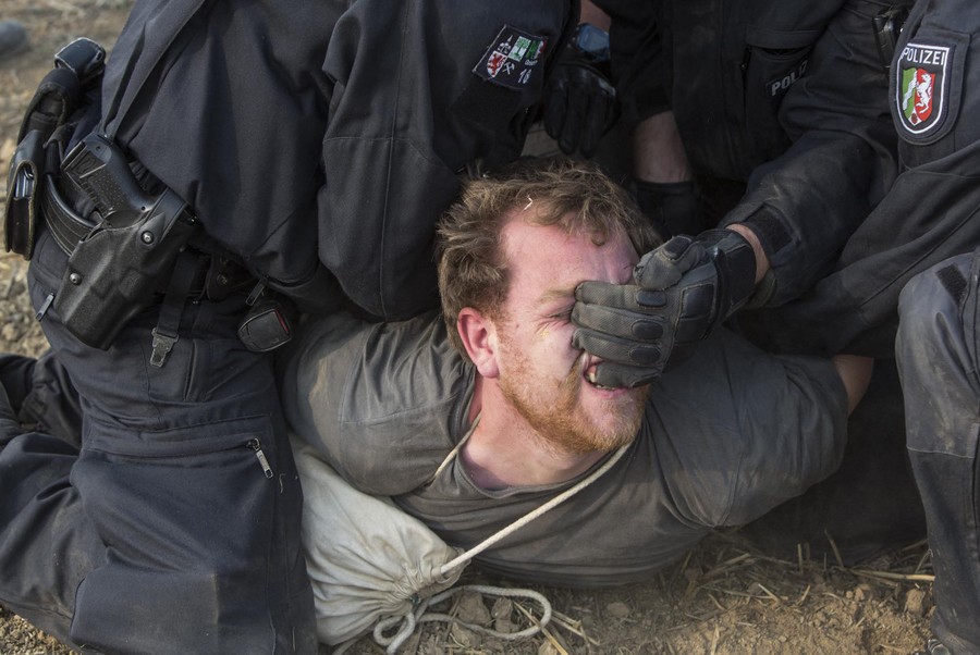 Read moreA protester is detained by two German police officers after he and others tried to reach a rail track in order to block it, in the Rhineland mines region west of Cologne on August 26, 2017, near the German village of Rath. The track serves as a main route for trains carrying coal to the power plants. Protesters seeking to bring attention to the impact of coal on climate change converged on the region for two days of disruptive disobedience. #