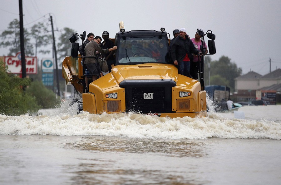 Read morePeople catch a ride on a construction vehicle down a flooded street as they evacuate their homes after the area was inundated with flooding from Hurricane Harvey on August 28, 2017, in Houston, Texas. #
