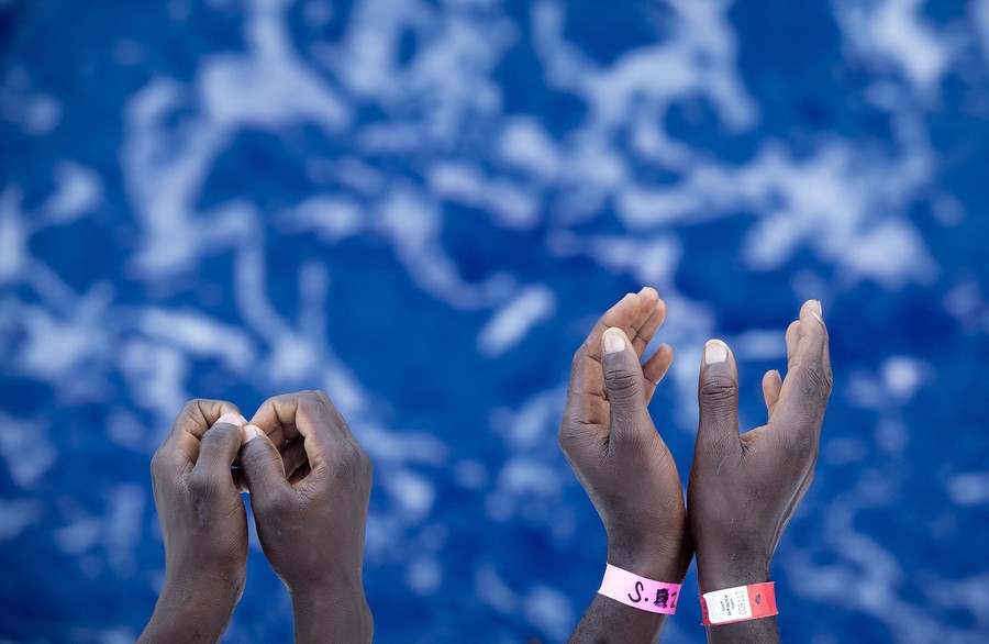 Read moreAfrican migrants stand on the deck of the Aquarius vessel of "SOS Mediterranee" and MSF (Doctors Without Borders) NGOs, in the Mediterranean Sea, southwest of Malta, on August 31, 2017. 265 people rescued from the sea during previous days were being transferred to Italy. #
