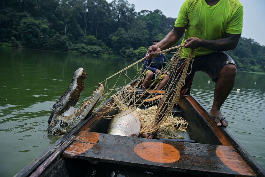 Read moreFishermen pull up a live 2.5-meter caiman in their net in the Western Amazon region, Brazil, on September 20, 2017. The fishermen were fishing for a large river fish called arapaima, but sometimes caimans become stuck in the nets as well. #
