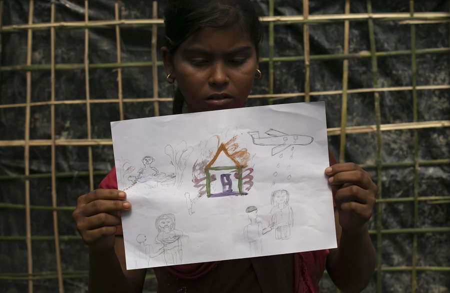 Read more12-year-old Kurshida holds a drawing she made at a CODEC and UNICEF "child friendly space" on September 21, 2017, in Cox's Bazar, Bangladesh. Kurshida fled to Bangladesh from Bourashidapara village in Burma almost a month ago. Her drawing depicts a scene that she witnessed while fleeing her village; the military shooting everywhere, lighting her home on fire, cutting her niece's throat with a machete while she slept, her newborn sister being shot, aircraft dropping bombs, and her neighbors being shot while they tried to flee. Over 230,000 child refugees have fled into Bangladesh since late August during the outbreak of violence in Rakhine state and are now in urgent need of help, according to UNICEF. With children making up around 60 percent of the 420,000 Rohingya that have fled into Bangladesh, many arrived in the makeshift tents highly traumatized after seeing family members killed and homes set on fire. Aid agencies like UNICEF are offering counseling for Rohingya children and have set up spaces for them to play and relax. They have so far counted more than 1,400 children who have crossed the border with no parents at all, and many children are displaying signs of trauma, such as shaking and the inability to interact with other people. #