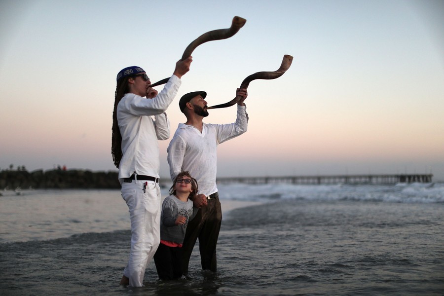 Read moreJared Stein (left) and Daniel Levitch (right) blow the shofar as Gillian Levitch, 4, watches at a Tashlich ceremony, a Rosh Hashanah ritual to symbolically cast away sins, during the Nashuva Spiritual Community Jewish New Year celebration on Venice Beach in Los Angeles, California, on September 21, 2017. #