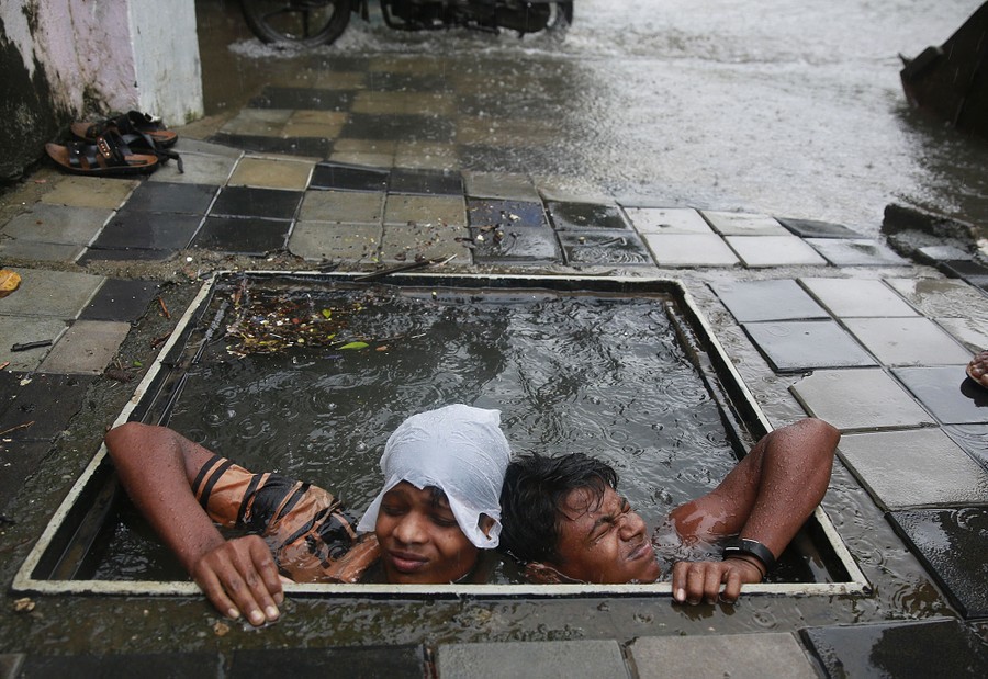 Read moreMunicipal workers try to retrieve the lid of a manhole to prevent pedestrians from falling in, in Mumbai, India, on September 20, 2017. Incessant rainfall in India's commercial capital has affected air and rail traffic, and schools and colleges remained shut for the day. #