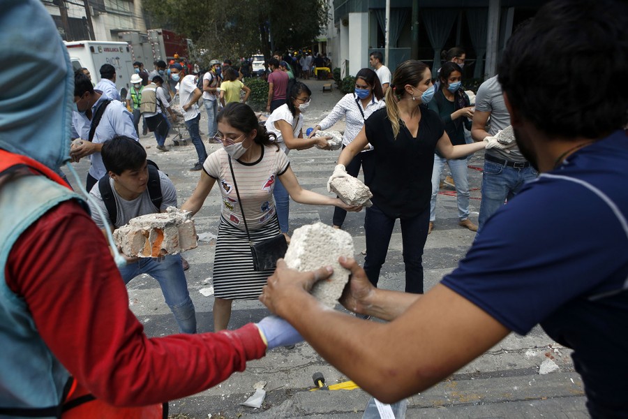 Read moreVolunteers pick up the rubble from a building that collapsed during Tuesday's earthquake in the Condesa neighborhood of Mexico City on September 19, 2017. Thousands of survivors quickly rallied across the city, clambering over grotesque ruins of buildings and joining professional rescue workers to try to save friends, neighbors, and strangers. #