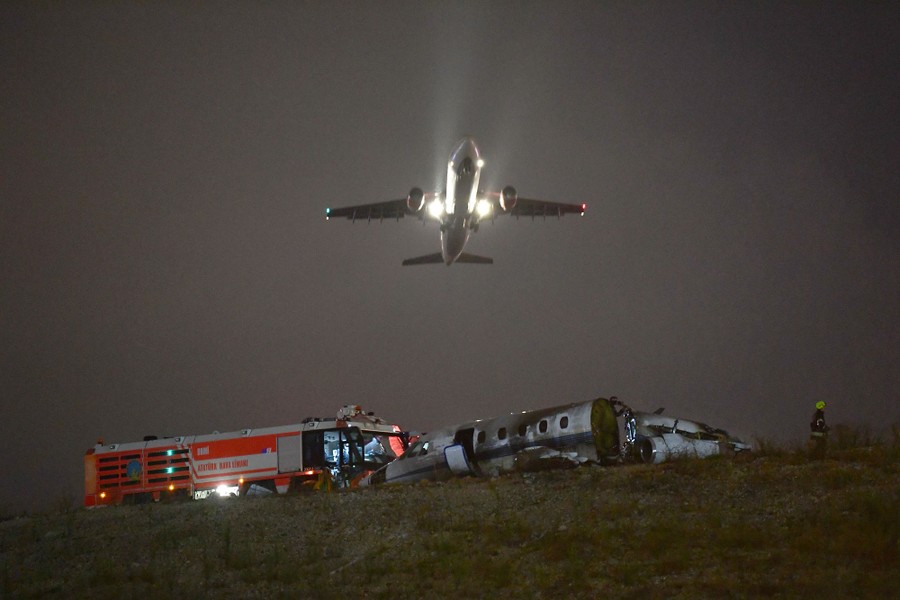 Read moreA plane passes as firefighters attempt to extinguish a burning private airplane after it crashed at Ataturk Airport on September 21, 2017, in Istanbul. Turkey's main international airport was closed to traffic on September 21 after the jet crashed on landing and burst into flames, reports said. The plane, which had four people on board, was making an emergency landing at Ataturk International Airport, the DHA news agency said. All four were injured but the fire was brought under control, NTV television said. #