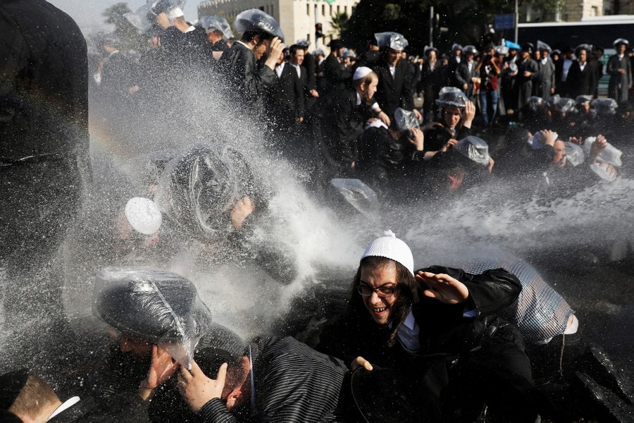 Read moreIsraeli ultra-Orthodox Jewish men are sprayed with water during clashes with police at a protest against the detention of a member of their community who refuses to serve in the Israeli army in Jerusalem on September 17, 2017. #