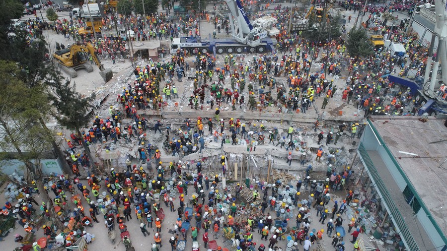 Read moreThis aerial view shows rescuers, firefighters, policemen, soldiers, and volunteers searching for survivors in a flattened building in Mexico City on September 20, 2017, a day after a strong quake hit. #