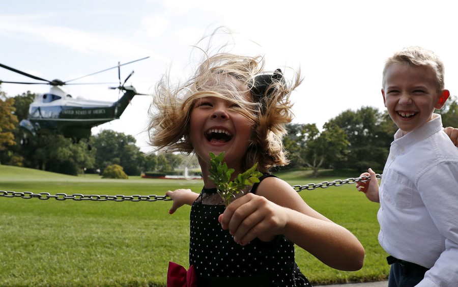 Read moreBrooke Fiddes, 5, and her brother Carter Fiddes, 9, both from Charlotte, North Carolina, react to the rotor wash of Marine One as President Donald Trump departs the South Lawn of the White House on September 26, 2017, in Washington, D.C. #