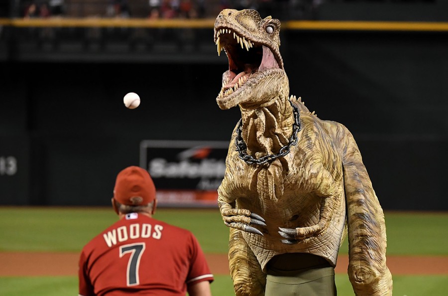 Read moreThe ceremonial first pitch was thrown out by a representative of the Phoenix Zoo, dressed in a super raptor costume, prior to a game between the Arizona Diamondbacks and the Miami Marlins at Chase Field on September 22, 2017, in Phoenix, Arizona. #