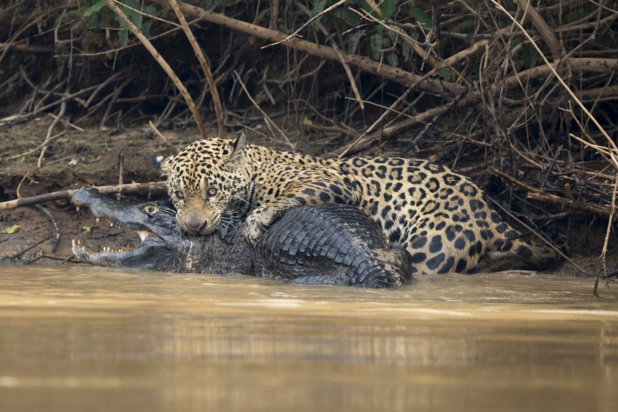 Read moreA jaguar ambushes a giant yacare caiman on the shore of the Three Brothers River in the Pantanal, in Mato Grosso, Brazil. The cat wrestled with the reptile for over 20 minutes in a death struggle witnessed by photographer Chris Brunskill on September 26, 2017. Caimans form a large part of the jaguar's diet in the Pantanal, but battles such as this are very rarely observed and seldom photographed. #