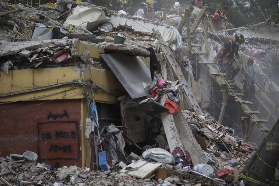 Read moreA rescue worker walks down a ladder as the search for people continues amid the rubble of a collapsed apartment complex in the southern neighborhood of Tlalpan, Mexico City, on September 25, 2017. The 7.1 magnitude quake on September 19 left the complex's 500 residents, mostly government employees, without a home after one of the 11 buildings collapsed and the others were damaged. #