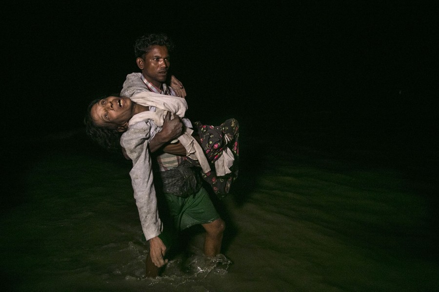 Read moreSona Banu is carried by Nobi Hossain to the shore of the Naf River, as hundreds of Rohingya arrived by boats in the safety of darkness on September 27, 2017, on Shah Porir Dwip Island, Cox's Bazar, Bangladesh. Over 480,000 Rohingya refugees have fled into Bangladesh since late August during the outbreak of violence in Burma's Rakhine state. #