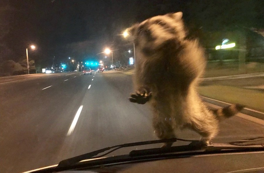 Read moreThis image released by the Colorado Springs Police Department, taken by a van's dash camera, shows a raccoon on a windshield. On September 20, 2017, Officer Chris Frabbiele was responding to an accident scene in a van used by police to investigate crashes when the raccoon landed on it. Police spokesman Lt. Howard Black says the raccoon hopped off the van after Frabbiele stopped it. #