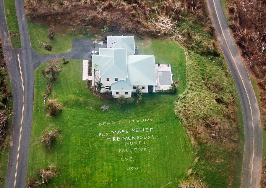 Read moreA giant sign in the front yard of a St. Croix homeowner asks U.S. President Donald Trump for "tremendous! huge! best ever!" relief for the U.S. Virgin Islands, as seen from a Navy helicopter passing over St. Croix, U.S. Virgin Islands, on September 25, 2017. #