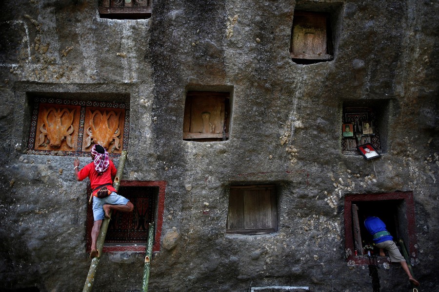 Read moreMen use bamboo ladders to open doors to burial chambers cut into a massive boulder of Loko'mata, a traditional Toraja burial site, during an ancient Torajan ritual known as "Ma'nene", near Rantepao, North Toraja, South Sulawesi, Indonesia, on September 11, 2017. #