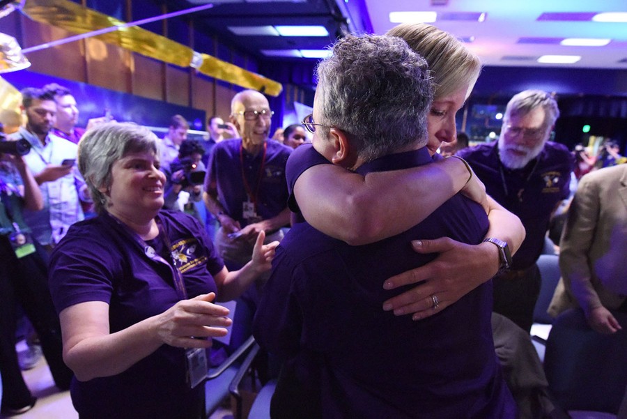 Read moreCassini science team members Nora Alonge (right), Scott Edgington (center) and Jo Pitesky (left) hug as the final loss of signal from the Cassini spacecraft is confirmed, indicating Cassini's destruction in Saturn's atmosphere and the end of Cassini's 20-year mission to gain a better understanding of the ringed planet and its icy moons, at the Jet Propulsion Laboratory in Pasadena, California, on September 15, 2017 . Within moments of loss of signal the spacecraft plunged into Saturn's atmosphere where it burned up and disappeared in what NASA called "The Grand Finale." #